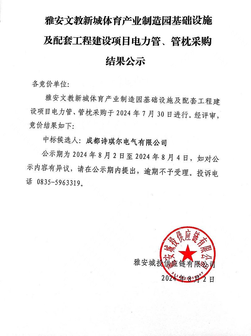 雅安文教新城體育產(chǎn)業(yè)制造園基礎(chǔ)設(shè)施及配套工程建設(shè)項(xiàng)目電力管、管枕采購(gòu)結(jié)果公示