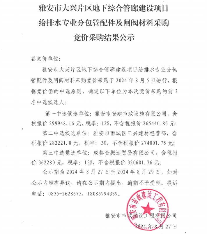 雅安市大興片區(qū)地下綜合管廊建設(shè)項目給排水專業(yè)分包管配件及閘閥材料采購結(jié)果公示