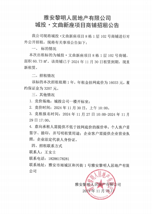 雅安黎明人居地產有限公司城投·文曲新座項目商鋪招租公告