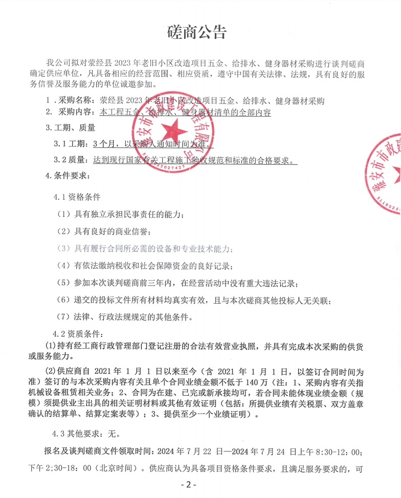 滎經縣2023年老舊小區(qū)改造項目五金、給排水、健身器材采購磋商公告