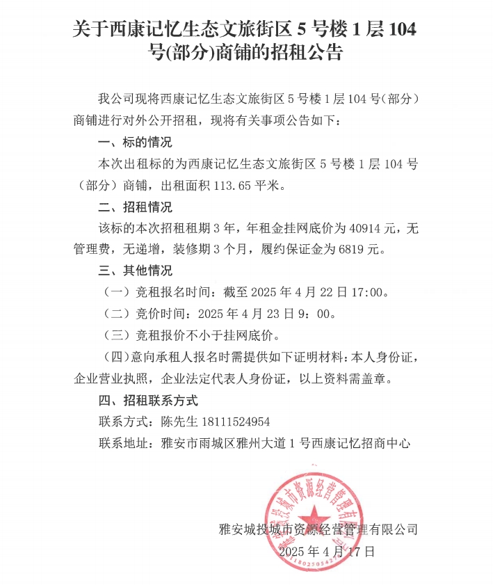 關(guān)于西康記憶生態(tài)文旅街區(qū)5號(hào)樓1層104號(hào)(部分)商鋪的招租公告