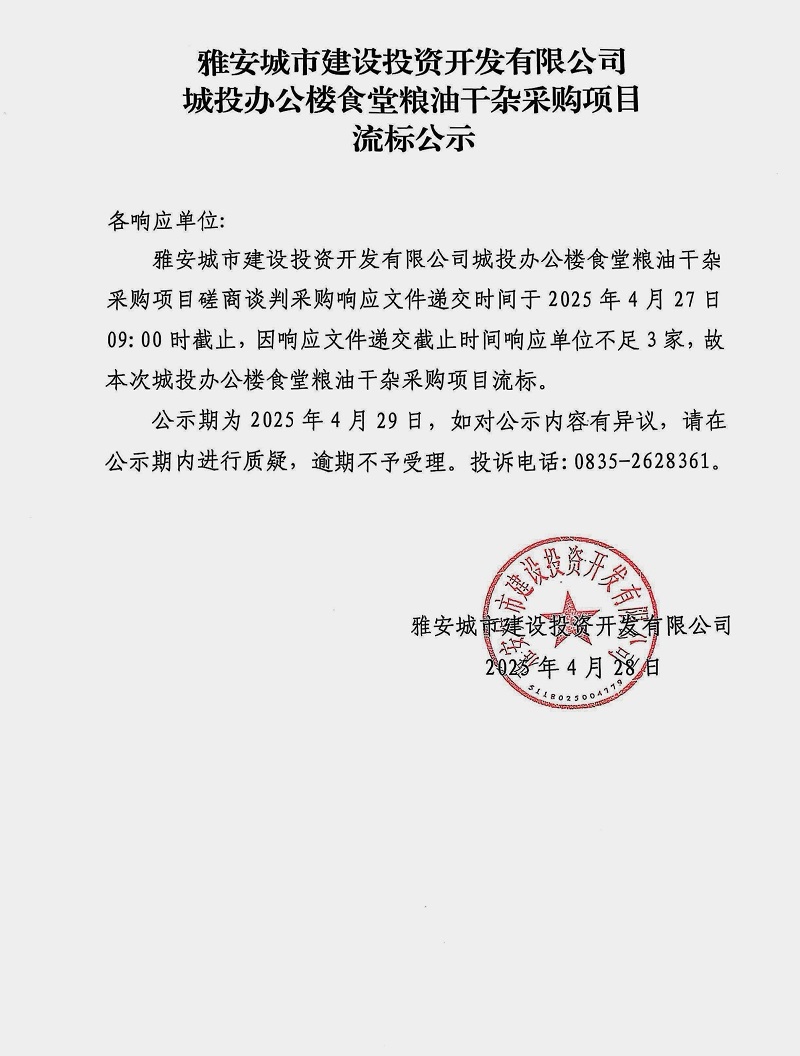 雅安城市建設投資開發(fā)有限公司辦公樓食堂干雜采購項目流標公示