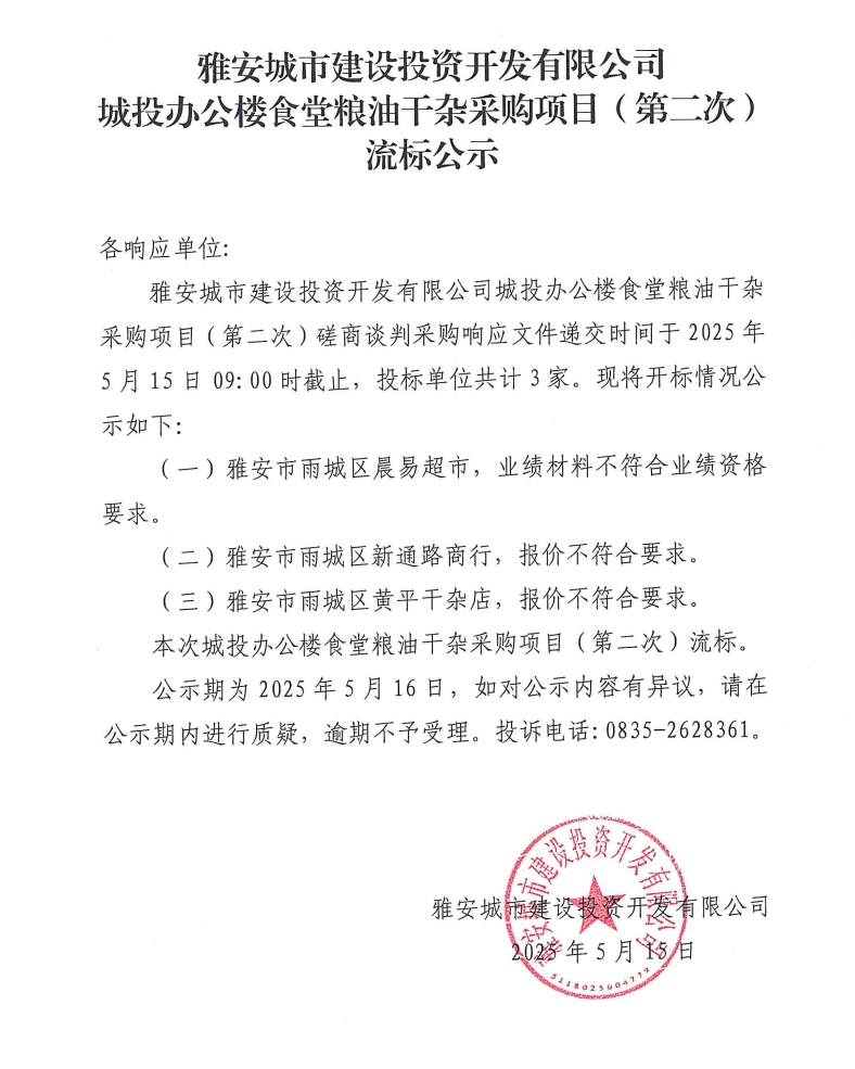雅安城市建設(shè)投資開發(fā)有限公司城投辦公樓食堂糧油干雜采購(gòu)項(xiàng)目(第二次)流標(biāo)公示