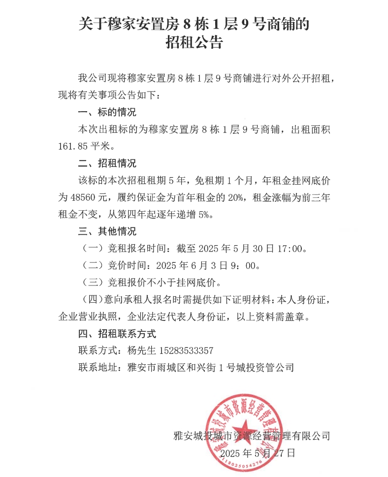 關(guān)于穆家安置房8棟1層9號(hào)商鋪的招租公告