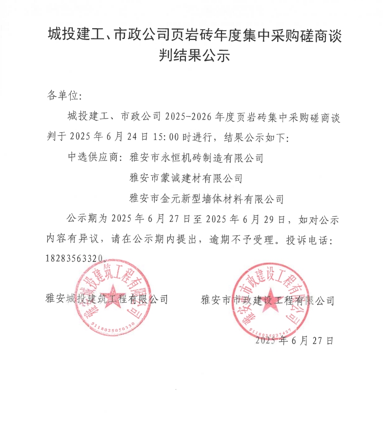 城投建工、市政公司頁巖磚年度集中采購磋商談判結(jié)果公示