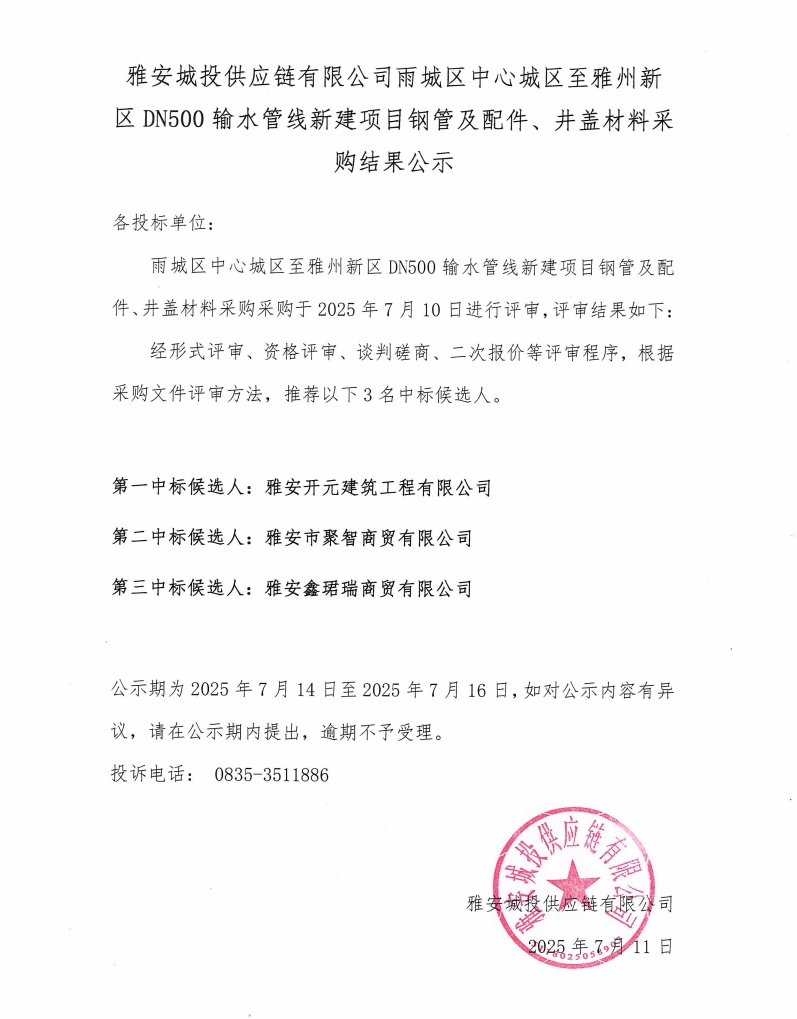 雅安城投供應(yīng)鏈有限公司雨城區(qū)中心城區(qū)至雅州新區(qū)DN500輸水管線新建項(xiàng)目鋼管及配件、井蓋材料采購(gòu)結(jié)果公示
