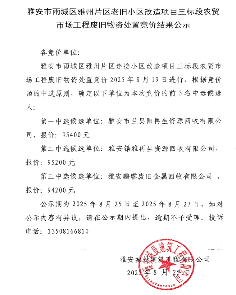 雅安市雨城區(qū)雅州片區(qū)老舊小區(qū)改造項目三標段農貿市場工程廢舊物資處置競價結果公示