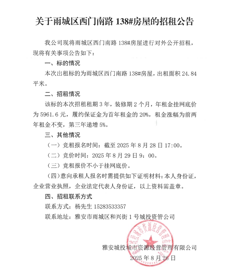 關于雨城區(qū)西門南路138#房屋的招租公告