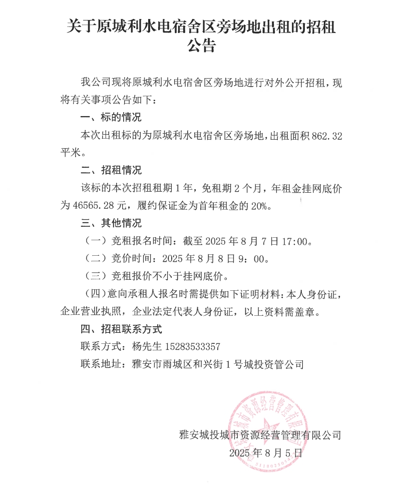 關(guān)于原城利水電宿舍區(qū)旁場(chǎng)地出租的招租公告