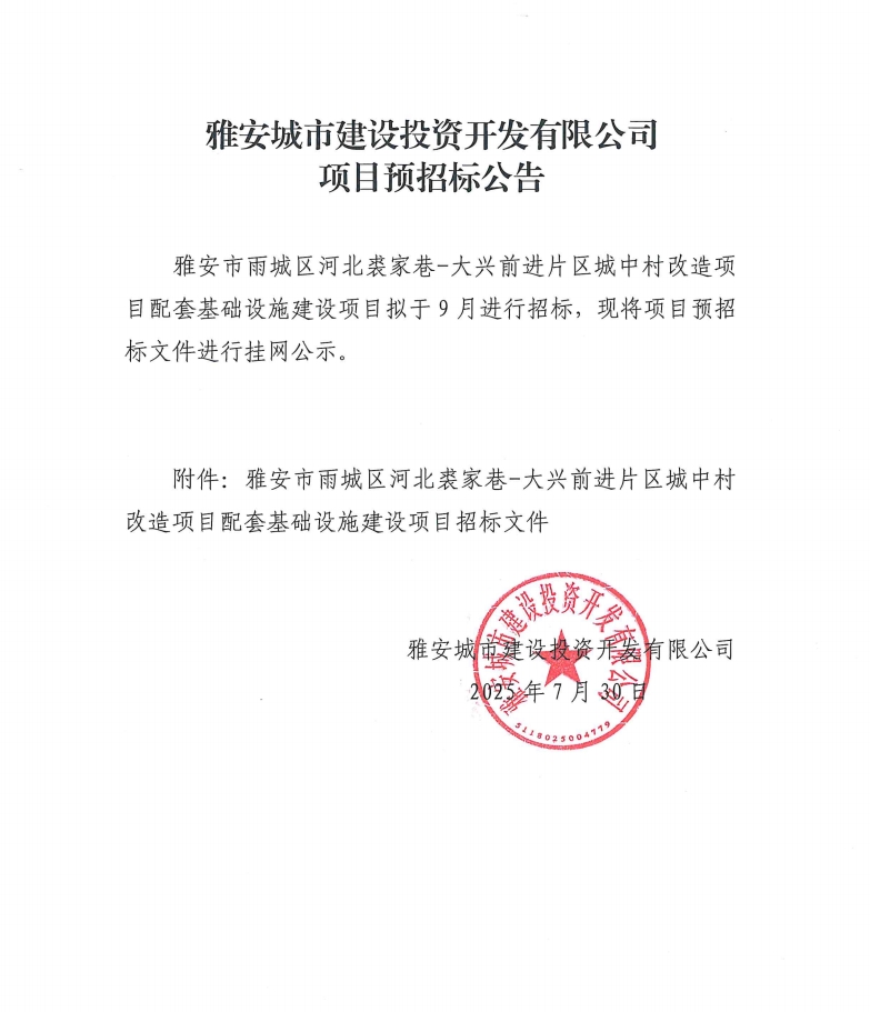 雅安市雨城區(qū)河北裘家巷-大興前進(jìn)片區(qū)城中村改造項目配套基礎(chǔ)設(shè)施建設(shè)項目預(yù)招標(biāo)公告