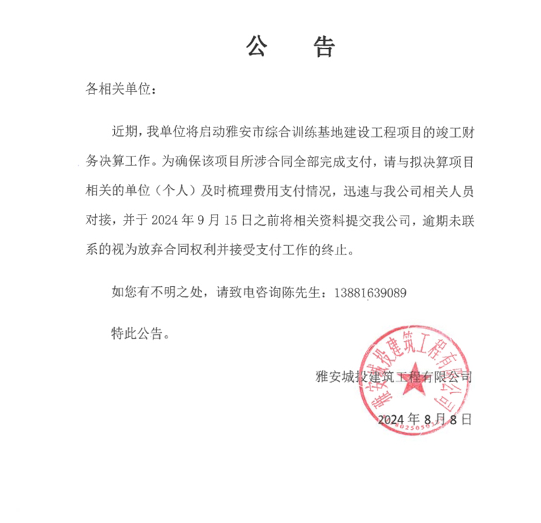 雅安市綜合訓練基地建設項目決算公告